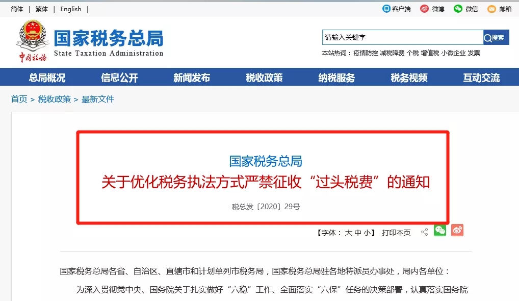國家稅務總局 關于優化稅務執法方式嚴禁征收“過頭稅費”的通知 稅總發〔2020〕29號 國家稅務總局各省、自治區、直轄市和計劃單列市稅務局,國家稅務總局駐各地特派員辦事處,局內各單位: 為深入貫徹黨中央、國務院關于扎實做好“六穩”工作、全面落實“六保”任務的決策部署,認真落實國務院常務會議有關精神,進一步提升政治站位,充分發揮稅收職能作用,統籌推進疫情防控和支持經濟社會發展,現就優化稅務執法方式、嚴禁征收“過頭稅費”有關要求進一步強調如下: 一、堅決防止違規征稅收費 各級稅務機關要進一步堅持依法規范組織收入原則不動搖,堅決壓實主體責任,嚴禁征收“過頭稅費”、違規攬稅收費以及以清繳補繳為名增加市場主體不合理負擔。堅決不搞大規模集中清欠、大面積行業檢查,堅決禁止采取空轉、轉引稅款等手段虛增收入。建立健全稅費收入質量監控和分析機制,利用大數據完善分區縣、分稅種、分時段的收入實時監控體系,對收入畸高畸低等異常情況,及時分析排查,發現違法違規行為一律嚴肅處理,并建立典型案例通報制度,強化以案示警的作用。要積極向地方黨委、政府和相關部門匯報,進一步爭取對依法依規組織稅費收入的支持,避免采取不當的組織收入措施。上級稅務部門要加強對下級稅務部門組織收入工作的監督指導,想方設法幫助其化解征收工作面臨的矛盾和壓力。 二、不斷改進稅收風險管理 健全事前事中事后全流程稅收風險管理運行機制,進一步完善基于大數據的“雙隨機、一公開”“信用+風險”監管方式,切實增強稅收風險管理的針對性和有效性,既有效防范和打擊偷騙稅行為,又盡最大可能不影響企業正常生產經營。統籌發揮好稅收風險管理服務自主遵從和規范稅收秩序的功能,以服務為導向,強化事前精準提示提醒,不得組織對某一行業開展多年期、撒網式的風險推送和自查補繳稅費,重視和保障納稅人、繳費人對推送風險的自訴權益,促進其及時補正、精準糾錯,避免違法違規風險;以規范為目的,強化事中精準控制、事后精準應對,嚴厲精準打擊“假企業”“假出口”“假申報”等涉稅違法行為,防止稅收流失,維護國家稅收安全。 三、積極支持新業態健康發展 主動適應新經濟不斷發展的新要求,持續完善支持電子商務、“互聯網+”等新興業態發展的稅收政策體系和管理服務措施,大力培育新興經濟增長點。繼續堅持包容審慎的原則,不得專門針對某一新興業態、新型商業模式,組織開展全面風險應對和稅務檢查。積極運用稅收大數據,深入分析線上經濟發展情況,完善精準化、精細化稅收服務和管理措施,促進線上線下融合,支持新興業態持續健康發展。 四、不折不扣落實稅費優惠政策 進一步落實落細黨中央、國務院出臺的系列稅費優惠政策,不斷鞏固和拓展政策實施成效。結合疫情防控,動態更新《支持疫情防控和經濟社會發展稅費優惠政策指引》,及時通過“云課堂”、線上答疑等方式,回應稅收熱點問題,深入開展針對性政策解讀和輔導,助力納稅人、繳費人應享盡享。適時開展減稅降費督查,狠抓發現問題整改,強化跟蹤問效,暢通政策落實“最后一公里”,確保減稅降費政策紅利直達困難企業、直達市場主體。 五、持續優化辦稅繳費服務 大力鞏固拓展“非接觸式”辦稅繳費服務,進一步擴大網上辦稅繳費事項范圍,確保主要辦稅繳費事項均能網上辦理。簡化優化稅費申報手續,加快推進增值稅、消費稅、城市維護建設稅主附稅合并申報和財產行為稅一體化納稅申報。繼續深化與銀保監部門和銀行業金融機構的合作,搭建“稅銀互動”信息共享平臺,擴大受益范圍,增進線上辦理便利,更好滿足企業特別是民營企業和小微企業信貸需求,助力緩解市場主體融資難題。 六、切實轉變工作作風 各級稅務機關要根據經濟社會發展的新形勢新情況,創新工作思路和工作方式,不能用老辦法解決新問題,不能用泛泛的方法解決個性化的問題。要妥善處理好稅收與經濟社會發展的關系,準確把握稅務執法的時度效,提高工作的精準性和精細度,防止粗放式管理和執法。要通過12366納稅服務熱線、稅務網站等渠道和實地走訪、第三方調查等方式,深入開展向納稅人、繳費人問需活動,積極幫助紓困解難,及時回應社會關切,以作風建設的新成效,促進稅收工作質效新提升。 國家稅務總局 2020年6月18日