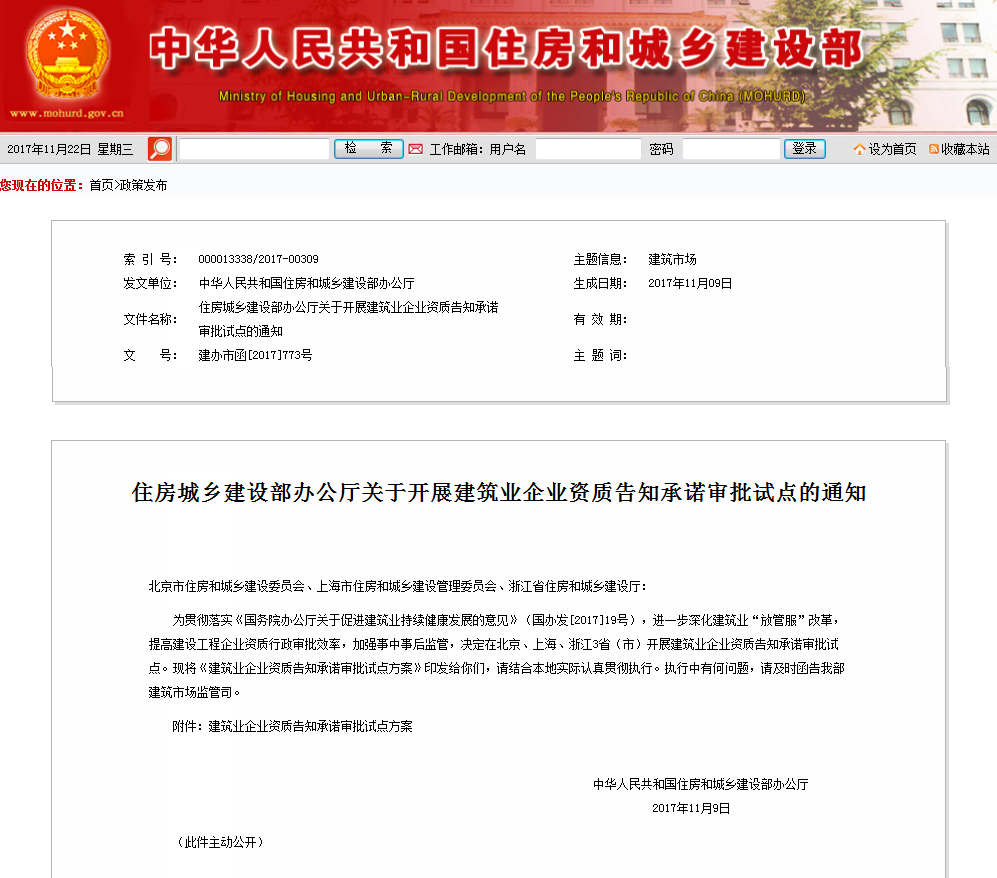 住建部《關于開展建筑業企業資質告知承諾審批試點的通知》